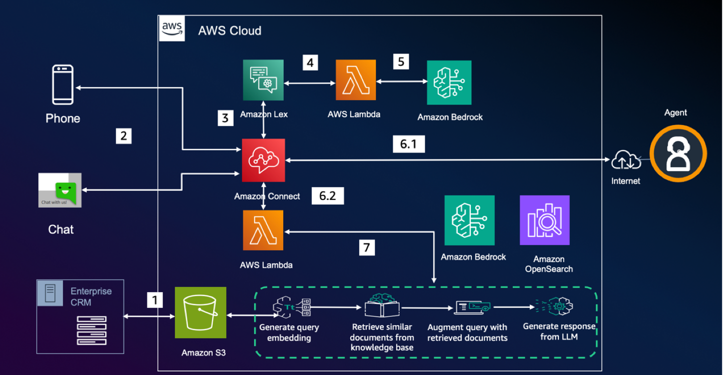 本方案基于亚马逊云科技Amazon Connect和Amazon Bedrock,结合大语言模型(LLM)和RAG知识库,实现全流程智能客服