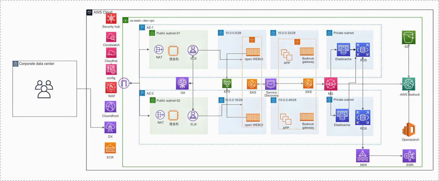 服务整体使用多可用区部署,避免因为故障导致服务访问受损,同时做到应用层和数据层进行分离,确保数据的可用性,所以员工通过dx进行连接,避免了网络的暴露,增加了访问安全性。