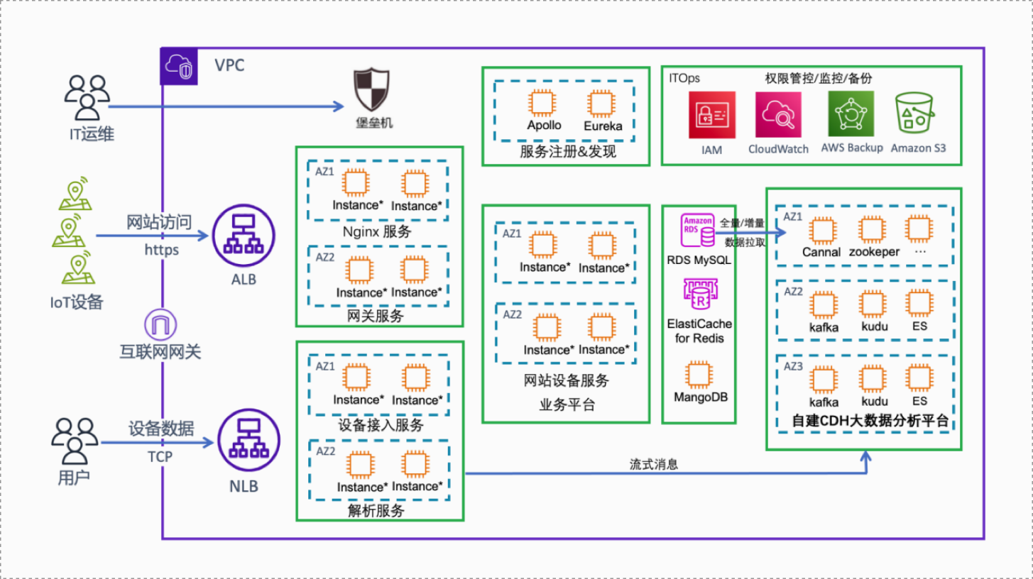 ● 在线数据层:Amazon RDS for MySQL存储核心业务数据,ElastiCache for Redis加速热点访问,MongoDB承载设备元数据;